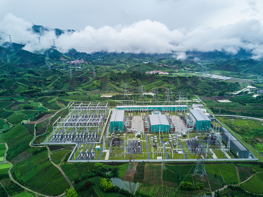 Vista aérea de un proyecto de transmisión de energía de corriente directa de 800 kilowatts ubicado en Jinhua, provincia de Zhejiang, que asegura la fuente de alimentación de China del este y reduce con eficacia la emisión de contaminación al medio ambiente. 23 de junio del 2017. [Foto: Xinhua]