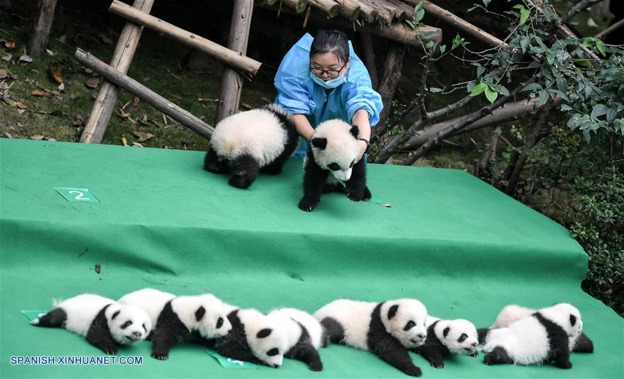 SICHUAN, septiembre 29, 2017 (Xinhua) -- Una cuidadora atiende a los cachorro de panda gigante en la Base de Investigación de Chengdu de Crianza del Panda Gigante, en Chengdu, ciudad capital de la provincia de Sichuan, en el suroeste de China, el 29 de septiembre de 2017. Un total de 10 cachorros nacidos en la base en 2017 fueron presentados al público el viernes en Chengdu. (Xinhua/Xue Yubin)