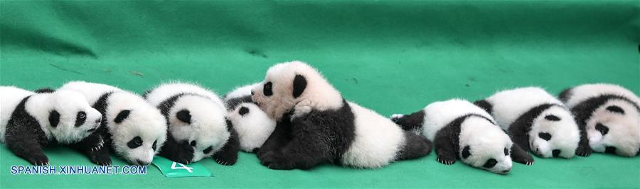 SICHUAN, septiembre 29, 2017 (Xinhua) -- Los cachorros de panda gigante permanecen en la Base de Investigación de Chengdu de Crianza del Panda Gigante, en Chengdu, ciudad capital de la provincia de Sichuan, en el suroeste de China, el 29 de septiembre de 2017. Un total de 10 cachorros nacidos en la base en 2017 fueron presentados al público el viernes en Chengdu. (Xinhua/Xue Yubin)