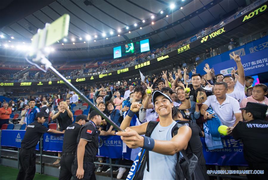 WUHAN, 30 sep (Xinhua) -- Caroline Garcia de Francia toma foto selfie tras el patido de la semifinal de individual femenino contra Maria Sakkari de Grecia en el Abierto Wuhan en Wuhan, capital de la provincia central china de Hubei, el 29 de septiembre. Caroline Garcia ganó 2-0.