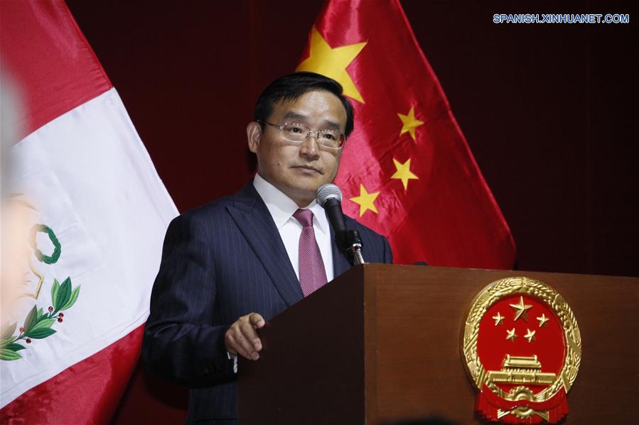 LIMA, septiembre 29, 2017 (Xinhua) -- Imagen del 28 de septiembre de 2017 del embajador de China en Perú, Jia Guide, pronunciando un discurso durante la ceremonia de celebración del 68 aniversario de la fundación de la República Popular China, en la embajada de China en Perú, en el distrito de San Isidro, Lima, Perú. "Lo que ha mostrado la República Popular China desde que se fundó en 1949 es un cambio absolutamente extraordinario en los anales de la historia mundial, ha habido momentos dolorosos pero se ve que hay un progreso constante", dijo el jueves el presidente de Perú, Pedro Pablo Kuczynski. Al intervenir en las celebraciones con motivo del Día Nacional de China en la embajada del país asiático en Lima, el mandatario peruano resaltó los lazos históricos, comerciales y productivos, que unen a los dos países, y se pronunció por ampliar lazos en el ámbito de la tecnología e infraestructura. Kuczynski a?adió que iba a tener el placer de reencontrarse con el presidente chino, Xi Jinping, en el marco del Foro de Cooperación Económica de Asia-Pacífico (APEC) en Vietnam, en noviembre próximo. (Xinhua/Luis Camacho)