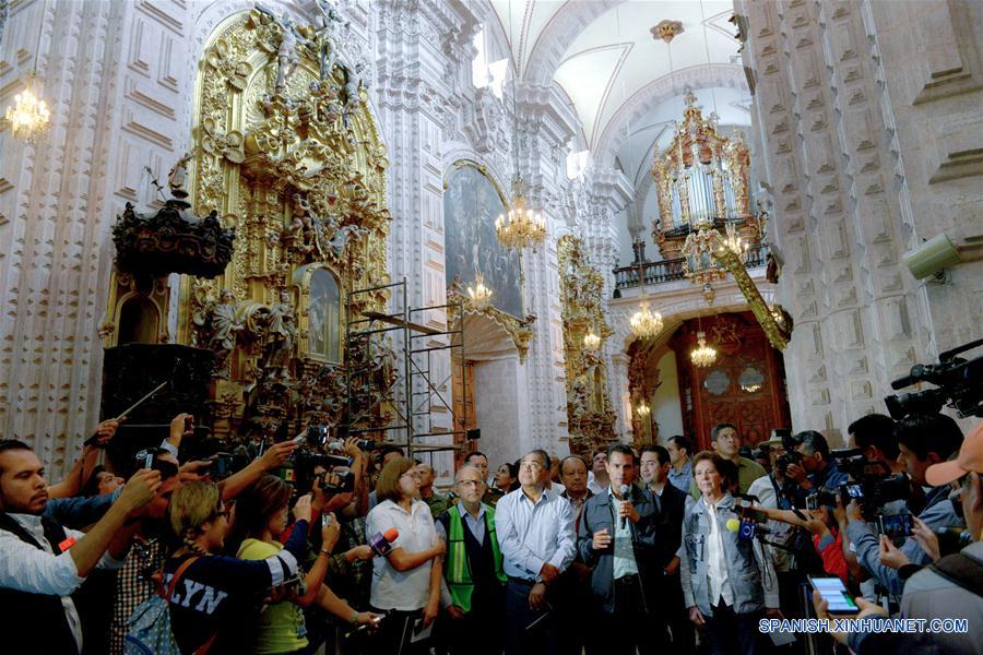 Imagen cedida por la Presidencia de México, del presidente mexicano, Enrique Pe?a Nieto (c), pronunciando un discurso durante una visita a la Iglesia de Santa Prisca en la ciudad de Taxco, estado de Guerrero, México, el 30 de septiembre de 2017. El presidente mexicano, Enrique Pe?a Nieto, dijo el sábado que las viviendas afectadas por los sismos del 7 y del 19 de septiembre serán reconstruidas en un periodo de cuatro meses. "Las viviendas yo creo que tendremos oportunidad en cuatro meses de tenerlas nuevamente reconstruidas, con el apoyo de la gente afectada, para apoyarlos en tareas de autoconstrucción y autoconstrucción asistida", declaró Pe?a Nieto durante una gira por la ciudad de Taxco, en el sure?o estado de Guerrero. (Xinhua/Presidencia de México)