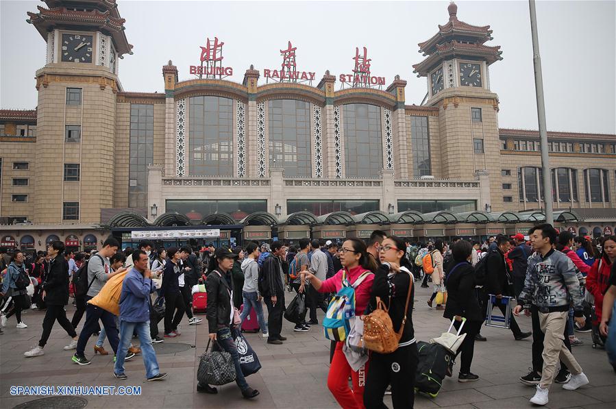 BEIJING, octubre 7, 2017 (Xinhua) -- Pasajeros caminan frente a la Estación del Ferrocarril de Beijing, en Beijing, capital de China, el 7 de octubre de 2017. Mientras las vacaciones del Día Nacional llegan a su fin, Beijing recibe un gran número de pasajeros de regreso al trabajo y el colegio. (Xinhua/Guo Junfeng)