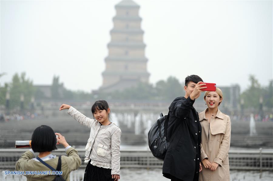 SHAANXI, octubre 6, 2017 (Xinhua) -- Turistas posan en la Pagoda Dayan en Xi'an, capital de la provincia de Shaanxi, en el noroeste de China, el 6 de octubre de 2017. En el sexto día de las vacaciones del Día Nacional, las personas alrededor del país pasan su tiempo en diferentes formas. (Xinhua/Zhang Bowen)