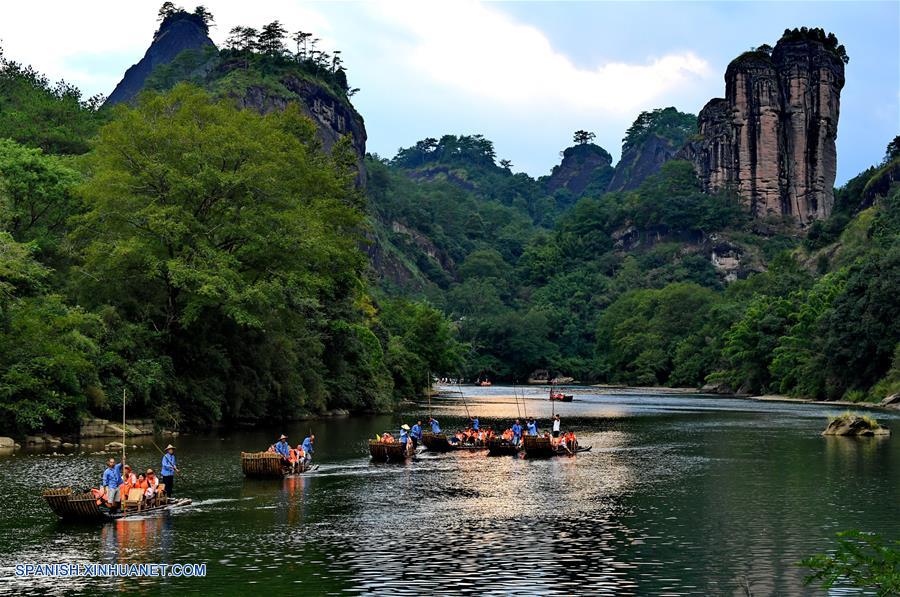 FUJIAN, octubre 2, 2017 (Xinhua) -- Turistas toman lanchas de bambú en el río Jiuqu en la zona escénica de la monta?a de Wuyi, durante el feriado de ocho días por el Día Nacional y el Festival de Medio Oto?o, en la provincia de Fujian, en el sureste de China, el 2 de octubre de 2017. (Xinhua/Zhang Guojun)