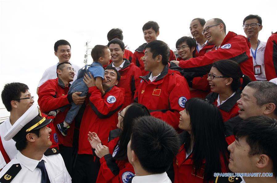 Shi Xing'an (2-d-atrás), miembro del equipo chino de expedición científica, es recibido por su hijo a su llegada a Shanghai, en el este China, el 10 de octubre de 2017. El rompehielos chino Xuelong (Dragon de Nieve) regresó el martes a su base en Shanghai después de 83 días al borde del Artico, completando su octava expedición ártica. (Xinhua/Fang Zhe)