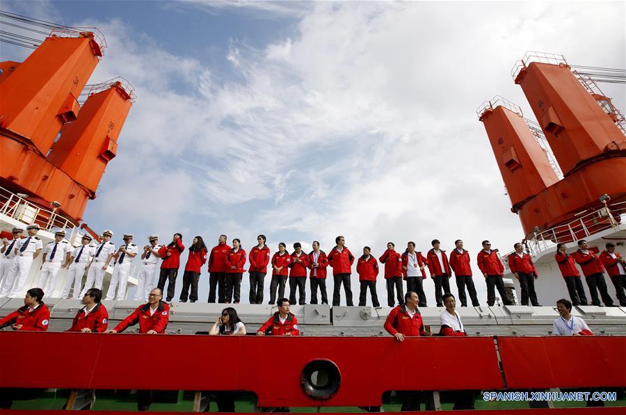 SHANGHAI, octubre 10, 2017 (Xinhua) -- Los miembros del equipo chino de expedición científica observan desde el rompehielos chino Xuelong a su regreso a Shanghai, en el este China, el 10 de octubre de 2017. El rompehielos chino Xuelong (Dragon de Nieve) regresó el martes a su base en Shanghai después de 83 días al borde del Artico, completando su octava expedición ártica. (Xinhua/Fang Zhe)