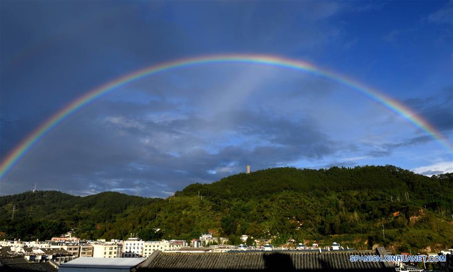 YUNNAN, octubre 16, 2017 (Xinhua) -- Imagen del 15 de octubre de 2017, de un arcoiris en el cielo en el Condado Autónomo Hani y Yi de Bing'er, en la ciudad de Pu'er, en la provincia de Yunnan, en el suroeste de China. Pu'er, una ciudad en el suroeste de Yunnan, se ha estado esforzando por reducir su población golpeada por la pobreza en los a?os recientes. En total, 527,000 personas han superado la pobreza en los últimos cinco a?os. Para agosto de 2017, el número de personas empobrecidas se ha reducido a 358,000. (Xinhua/Lin Yiguang)