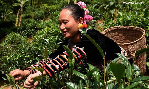 Li Napi, de un grupo étnico local de Lahu, recoge hojas de té en Jiujing, Pu'er, provincia de Yunnan. En los últimos cinco a?os, 527,000 personas han logrado salir de la pobreza. En agosto del 2017, aún 358,000 permanecían en esta desdichada condición. 23 de septiembre del 2016. (Foto: Xinhua)