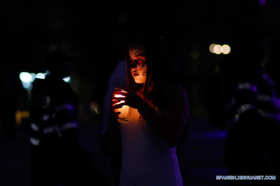 Una joven participa en el evento "Noche de Velas", un homenaje a las víctimas de los terremotos del 7 y 19 de septiembre, en el Monumento a la Revolución, en la Ciudad de México, capital de México, el 15 de octubre de 2017. (Xinhua/Francisco Ca?edo)
