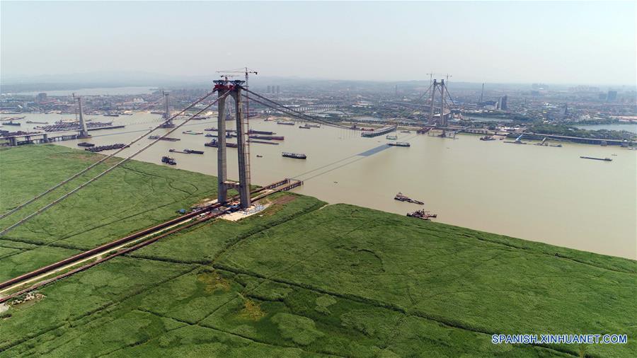 HUNAN, octubre 16, 2017 (Xinhua) --Imagen del 9 de mayo de 2017, del sitio de construcción del Puente del Lago Dongting de la autopista Hangzhou-Ruili en Yueyang, en la provincia de Hunan, en el centro de China. El Yangtze, el tercer río más largo del mundo, atraviesa nueve provincias chinas y dos municipalidades, cubriendo 2.05 millones de kilómetros cuadrados. El Cinturón Económico del Río Yangtze, que representa más del 40 por ciento de la población nacional y el Producto Interno Bruto (PIB), es un nuevo motor de crecimiento para el país, reduciendo la brecha de desarrollo entre las regiones del este, oeste y centro. (Xinhua/Li Ga)