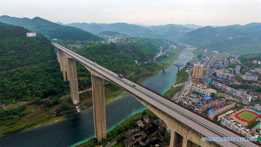 GUIZHOU, octubre 16, 2017 (Xinhua) --Imagen del 8 de mayo de 2017, de la vista aérea de puentes sobre el río Wujiang, un afluente en la margen sur de la parte alta del Yangtze, en la provincia de Guizhou, en el suroeste de China. El Yangtze, el tercer río más largo del mundo, atraviesa nueve provincias chinas y dos municipalidades, cubriendo 2.05 millones de kilómetros cuadrados. El Cinturón Económico del Río Yangtze, que representa más del 40 por ciento de la población nacional y el Producto Interno Bruto (PIB), es un nuevo motor de crecimiento para el país, reduciendo la brecha de desarrollo entre las regiones del este, oeste y centro. (Xinhua/Ou Dongqu)