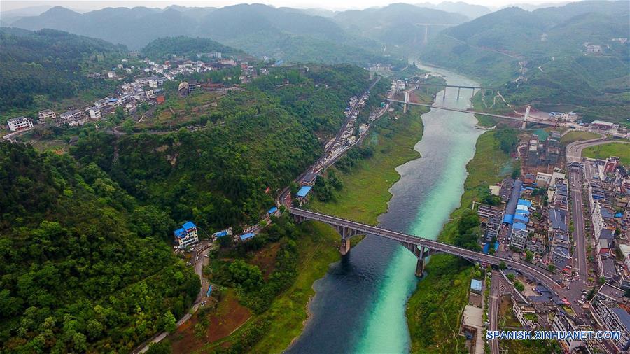 Imagen del 8 de mayo de 2017, de la vista aérea de puentes sobre el río Wujiang, un afluente en la margen sur de la parte alta del Yangtze, en la provincia de Guizhou, en el suroeste de China. El Yangtze, el tercer río más largo del mundo, atraviesa nueve provincias chinas y dos municipalidades, cubriendo 2.05 millones de kilómetros cuadrados. El Cinturón Económico del Río Yangtze, que representa más del 40 por ciento de la población nacional y el Producto Interno Bruto (PIB), es un nuevo motor de crecimiento para el país, reduciendo la brecha de desarrollo entre las regiones del este, oeste y centro. (Xinhua/Ou Dongqu)