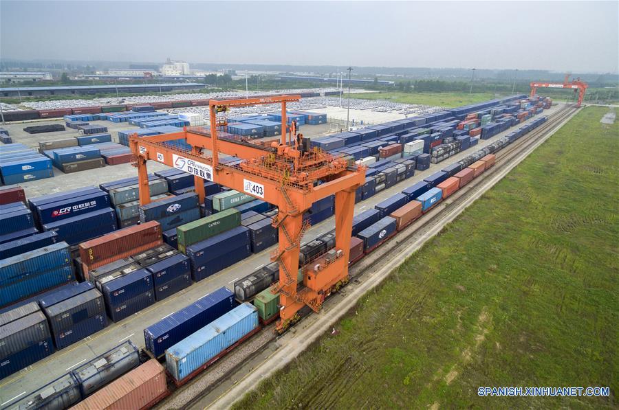 HUBEI, octubre 16, 2017 (Xinhua) --Imagen del 11 de mayo de 2017, de una estación de contenedores de un tren de carga sino-europeo dn Wuhan, en la provincia de Hubei, en el centro de China. El Yangtze, el tercer río más largo del mundo, atraviesa nueve provincias chinas y dos municipalidades, cubriendo 2.05 millones de kilómetros cuadrados. El Cinturón Económico del Río Yangtze, que representa más del 40 por ciento de la población nacional y el Producto Interno Bruto (PIB), es un nuevo motor de crecimiento para el país, reduciendo la brecha de desarrollo entre las regiones del este, oeste y centro. (Xinhua/Xiao Yijiu)