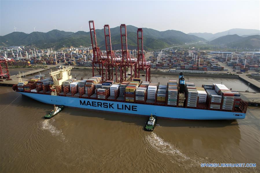 ZHEJIANG, octubre 16, 2017 (Xinhua) --Imagen del 9 de mayo de 2017, de un buque de carga en el Puerto Ningbo Zhoushan en la provincia de Zhejiang, en el este de China. El Yangtze, el tercer río más largo del mundo, atraviesa nueve provincias chinas y dos municipalidades, cubriendo 2.05 millones de kilómetros cuadrados. El Cinturón Económico del Río Yangtze, que representa más del 40 por ciento de la población nacional y el Producto Interno Bruto (PIB), es un nuevo motor de crecimiento para el país, reduciendo la brecha de desarrollo entre las regiones del este, oeste y centro. (Xinhua/Huang Zongzhi)