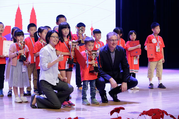 Los jóvenes ganadores chinos del grupo de participantes del segmento China de la Qooco Spelling Asia Cup 2017, reciben sus premios de mano de David Topolewski, CEO de Qooco, y de la CTO Mou Hong (primera a la izquierda, primera fila). [Foto proporcionada]