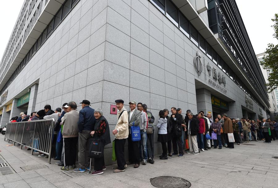 Coleccionistas aguardan su turno para adquirir los nuevos sellos postales con motivo del XIX Congreso Nacional del Partido Comunista de China. La empresa Correos de China emitió un conjunto de dos sellos postales alegóricos al magno evento. Nanjing, provincia de Jiangsu. [Foto: Xinhua]