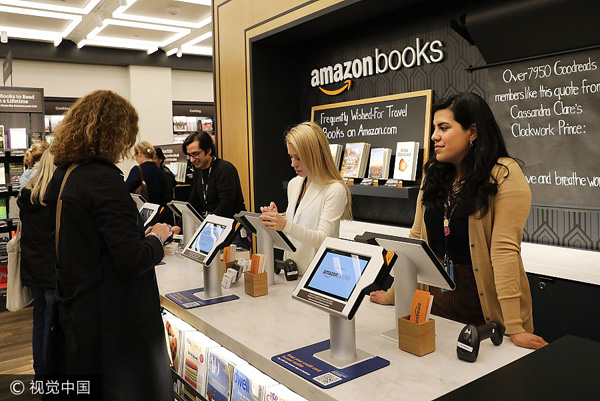 Lectores adquieren libros en la tienda Amazon Books de Nueva York, utilizando el pago móvil de Amazon para pagar sus compras. [Foto: VCG]