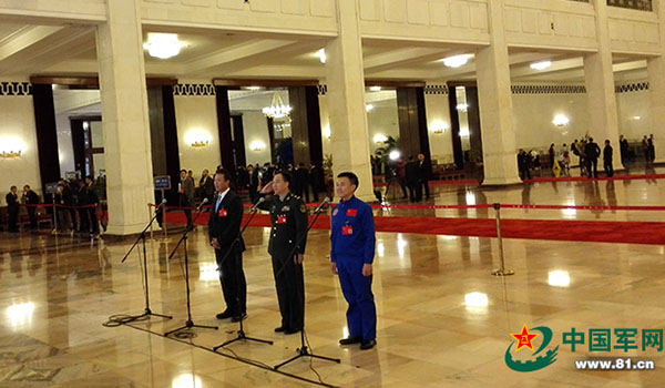 Jing Haipeng, astronauta del Ejército Popular de Liberación "Medalla al meritorio aeroespacial de máxima clase" y "Medalla 1ro de Agosto", se convirtió en el primer delegado que dialogó con la prensa en el corredor del Gran Salón de Pueblo.