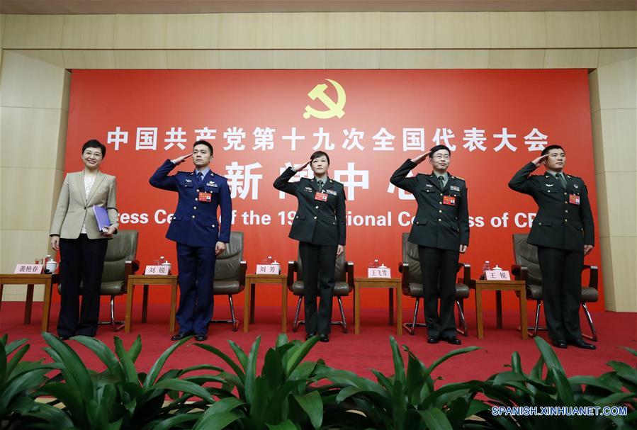 BEIJING, octubre 22, 2017 (Xinhua) -- El centro de prensa del XIX Congreso Nacional del Partido Comunista de China (PCCh) lleva a cabo una entrevista grupal sobre "pasos firmes en el camino con peculiaridades chinas en el fortalecimiento del Ejército" en Beijing, capital de China, el 22 de octubre de 2017. Liu Rui, jefe de un regimiento de aviación de la Fuerza Aérea del Ejército Popular de Liberación (EPL), Liu Fang, oficial de la Oficina de Cooperación Militar Internacional de la Comisión Militar Central, Wang Feixue, un profesor de la Universidad Nacional de Tecnología de Defensa, y Wang Rui, un comandante de un vehículo de asalto anfibio blindado de una brigada de armas combinadas en el 74 cuerpo del Ejército del EPL, estuvieron presentes en la entrevista grupal. (Xinhua/Shen Bohan)