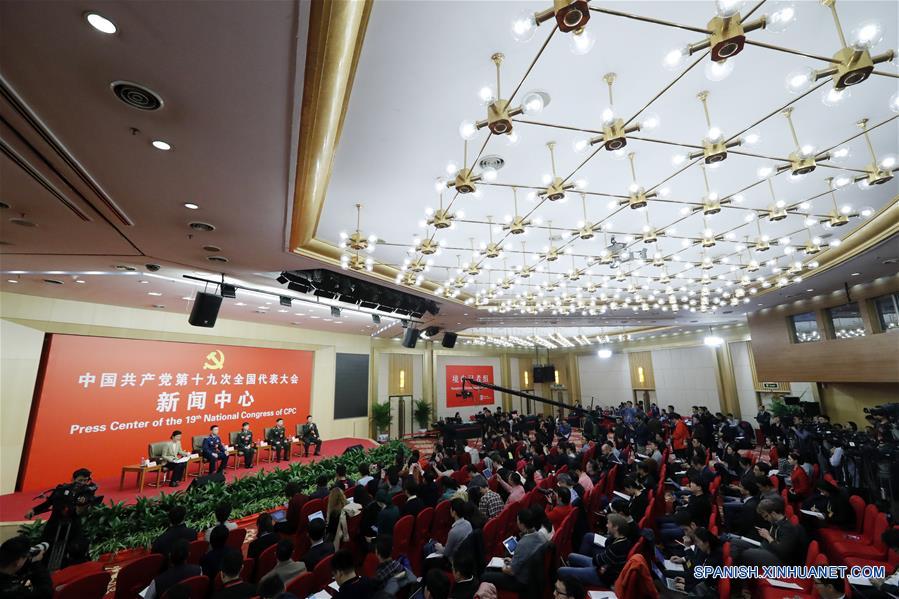 BEIJING, octubre 22, 2017 (Xinhua) -- El centro de prensa del XIX Congreso Nacional del Partido Comunista de China (PCCh) lleva a cabo una entrevista grupal sobre "pasos firmes en el camino con peculiaridades chinas en el fortalecimiento del Ejército" en Beijing, capital de China, el 22 de octubre de 2017. (Xinhua/Shen Bohan)