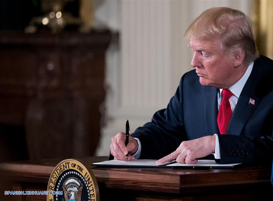 El presidente estadounidense, Donald Trump, firma un memorando presidencial durante un evento en el que destaca los esfuerzos para combatir la crisis de opioides, en la Casa Blanca, en Washington D.C., Estados Unidos, el 26 de octubre de 2017. (Xinhua/Ting Shen)