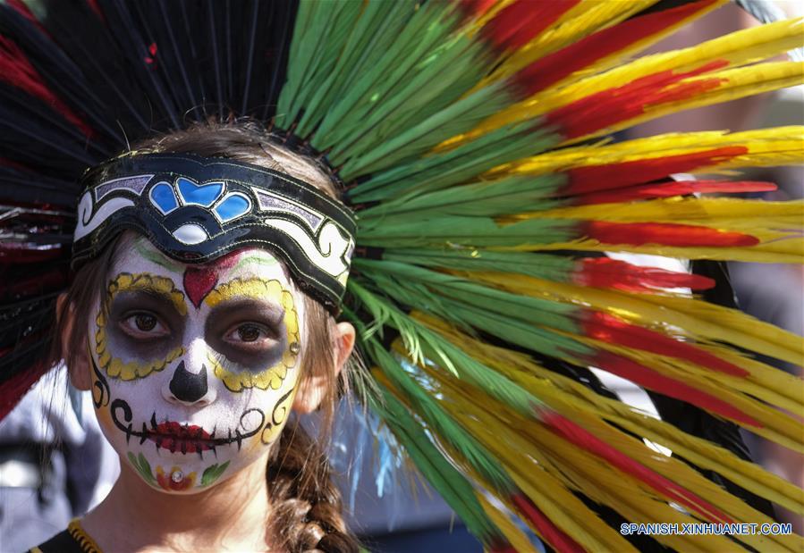 Una persona participa durante la celebración del Día de Muertos, en el Cementerio Hollywood Forever en Los Angeles, Estados Unidos, el 28 de octubre de 2017. De acuerdo con información de la prensa local, la conmemoración de la tradición mexicana del Día de Muertos atrajo a muchos turistas el sábado. (Xinhua/Zhao Hanrong)