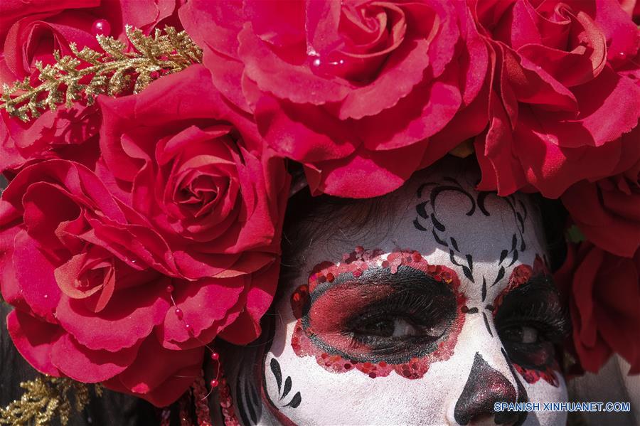 Una persona participa durante la celebración del Día de Muertos, en el Cementerio Hollywood Forever en Los Angeles, Estados Unidos, el 28 de octubre de 2017. De acuerdo con información de la prensa local, la conmemoración de la tradición mexicana del Día de Muertos atrajo a muchos turistas el sábado. (Xinhua/Zhao Hanrong)