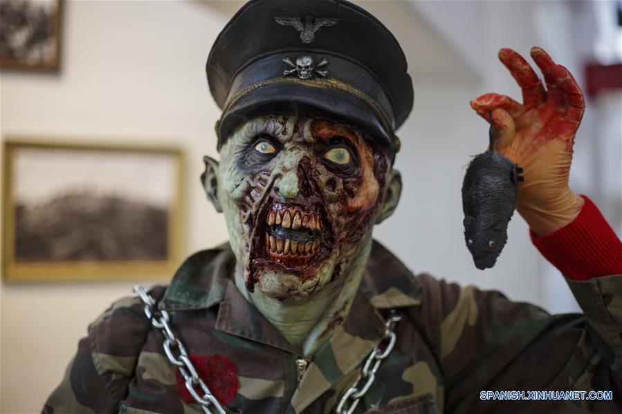 Una persona participa durante la "Zombie Walk" de Quito, en el centro histórico de Quito, capital de Ecuador, el 28 de octubre de 2017. De acuerdo con información de la prensa local, la "Zombie Walk" de Quito de este a?o es la octava edición del evento, que se lleva a cabo en distintos lugares del mundo para celebrar la época de Halloween. (Xinhua/Santiago Armas)