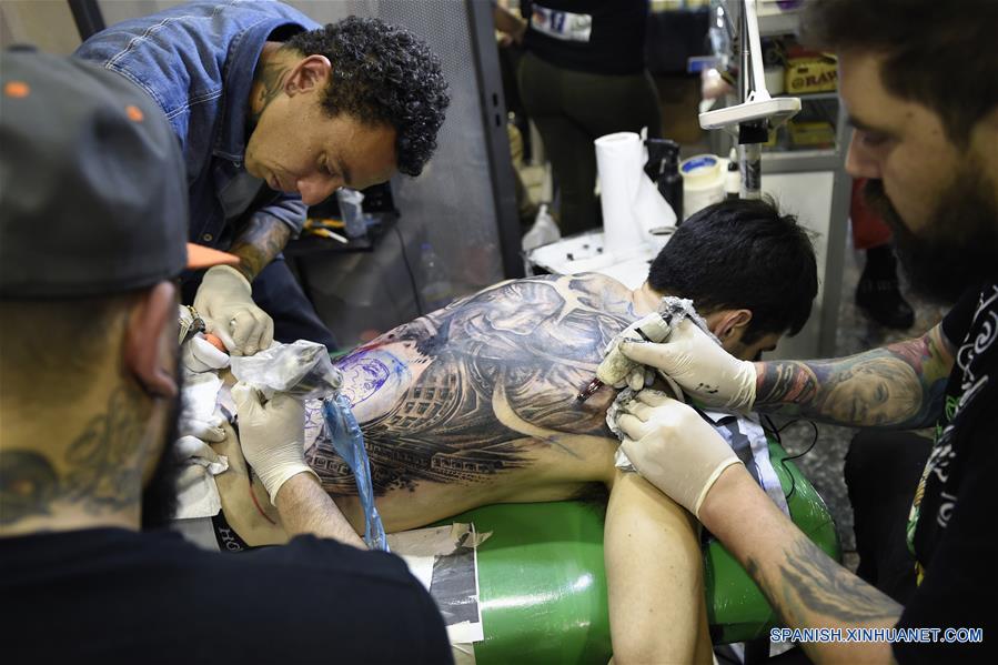 Tatuadores realizan un tatuaje a un hombre durante la 5 Convención de Tatuajes, en la Intendencia de Montevideo, en Montevideo, capital de Uruguay, el 28 de octubre de 2017. De acuerdo con información de la prensa local, la 5 Convención de Tatuajes se lleva a cabo los días 28 y 29 de octubre en Montevideo. (Xinhua/Nicolás Celaya)