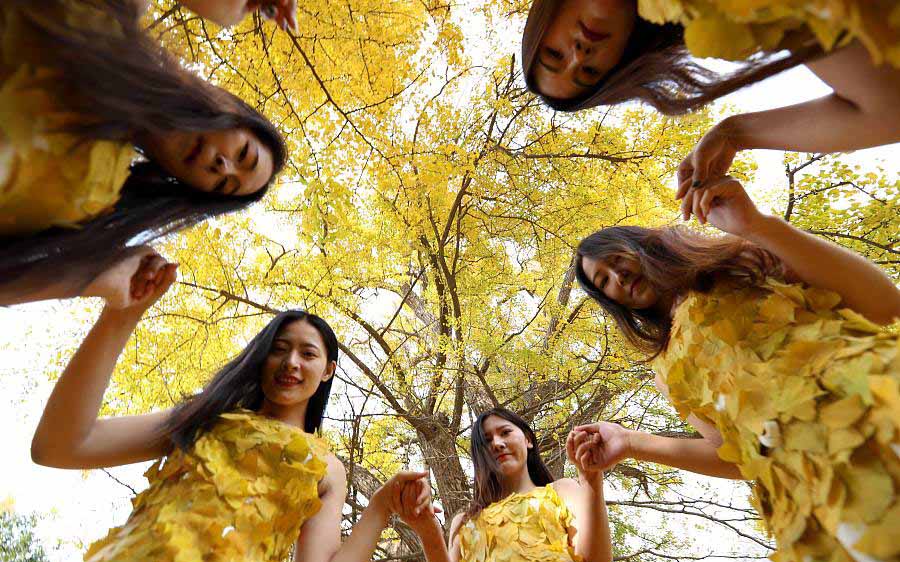 Cinco estudiantes universitarias visten ropa hecha de "oro de gingko" de la monta?a Baiyun en Luoyang, provincia de Henan, 29 de octubre del 2017. Hay un total de 413 árboles ginkgo en la monta?a. Los más ancianos tienen más de 2.300 a?os de antigüedad. [Foto: VCG]
