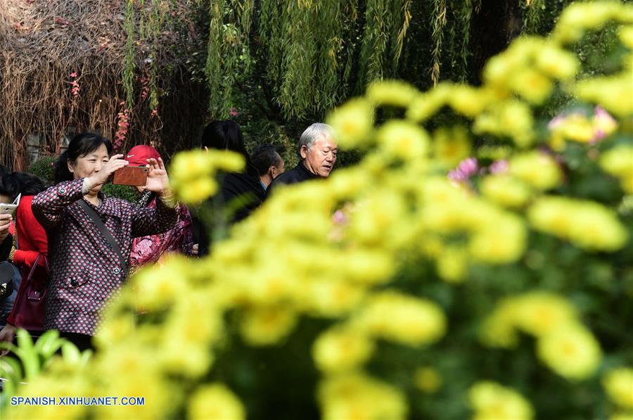 JINAN, noviembre 2, 2017 (Xinhua) -- Personas visitan las flores de crisantemo en el Parque Primavera de Baotu, en Jinan, ciudad capital de la provincia de Shandong, en el este de China, el 2 de noviembre de 2017. Más de 500 variedades de crisantemo son exhibidas en la 38 Exposición del Crisantemo del Parque Primavera de Baotu que permanecerá hasta el 25 de noviembre. (Xinhua/Li Ziheng)