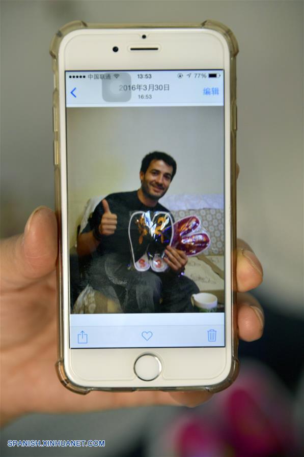 HUBEI, noviembre 2, 2017 (Xinhua) -- Zhou Yinju, una heredera provincial del bordado Tujia, muestra una fotografía de un cliente extranjero sosteniendo zapatillas bordadas, en el condado de Xuanen, en la Prefectura Autónoma Tujia de Enshi, provincia de Hubei, en el centro de China, el 2 de noviembre de 2017. El bordado fue una habilidad básica para las residentes en el pasado y muestra la cultura del grupo étnico Tijua. (Xinhua/Song Wen)