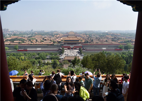 Los turistas observan el Museo del Palacio desde el Parque Jingshan. [Foto / Xinhua]