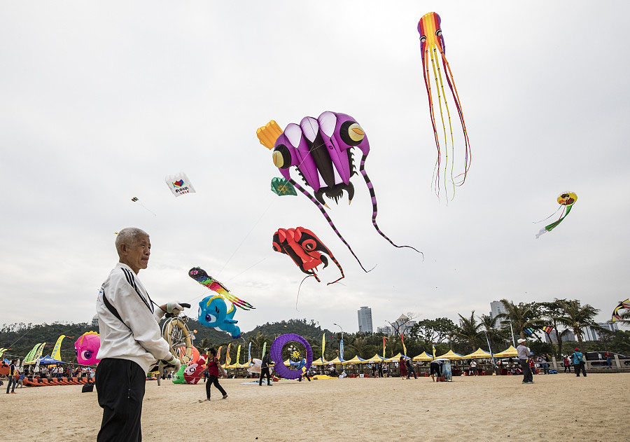 Un hombre vuela su cometa en el Festival de Cometas en Zhuhai, provincia de Guangdong el sábado. [Foto / VCG]