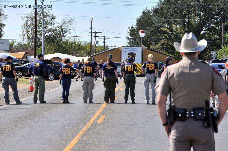 TEXAS, noviembre 6, 2017 (Xinhua) -- Agentes del Buró Federal de Investigaciones (FBI, por sus siglas en inglés) buscan evidencia cerca de la iglesia donde un ocurrió un tiroteo, en Sutherland Springs, estado de Texas, Estados Unidos, el 6 de noviembre de 2017. Una "situación doméstica" fue parte de los motivos del tiroteo ocurrido el domingo en una iglesia de Texas en el que murieron al menos 26 personas, confirmó el lunes un agente del orden de Texas. (Xinhua/Liu Liwei)