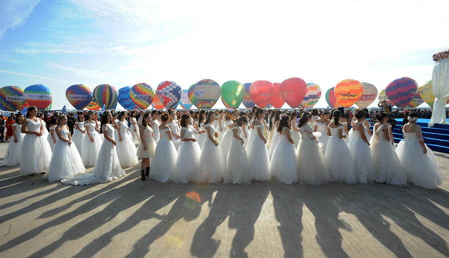 Las mujeres vestidas de novia participan en el evento el lunes. [Foto / VCG]