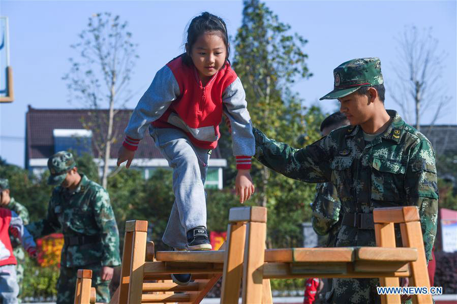 Un bombero ayuda a una ni?a a entrenar su capacidad de escalada en el condado de Changxing, provincia de Zhejiang, este de China, el 4 de noviembre de 2017. [Foto / Xinhua]