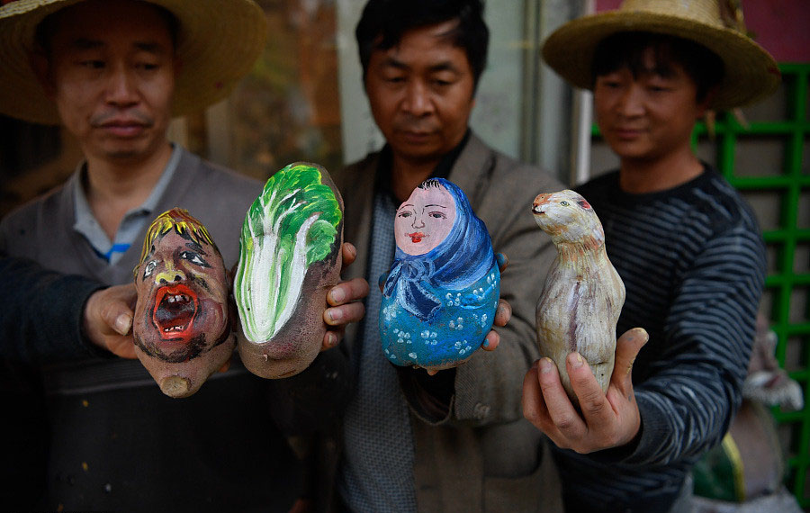 Las obras de Liu hechas con patatas. [Foto / VCG]