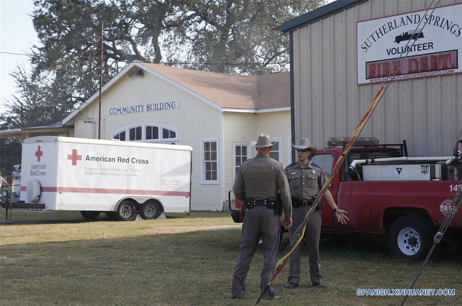 TEXAS, noviembre 7, 2017 (Xinhua) -- Elementos de seguridad montan guardia cerca del sitio donde un ocurrió un tiroteo, en Sutherland Springs, estado de Texas, Estados Unidos, el 6 de noviembre de 2017. Una "situación doméstica" fue parte de los motivos del tiroteo ocurrido el domingo en una iglesia de Texas en el que murieron al menos 26 personas, confirmó el lunes un agente del orden de Texas. (Xinhua/Li Ying)