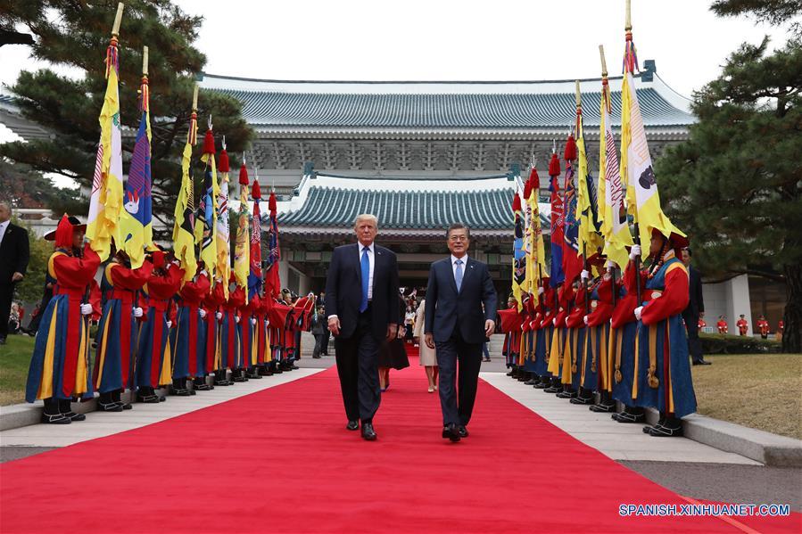 El presidente de la República de Corea, Moon Jae-in (d), recibe al presidente de Estados Unidos, Donald Trump (i), en la residencia presidencial en Seúl, República de Corea, el 7 de noviembre de 2017. El presidente de Estados Unidos, Donald Trump, y su homólogo surcoreano, Moon Jae-in, acordaron el martes resolver pacíficamente los problemas en la península coreana e impulsar rápidamente las negociaciones para un acuerdo de libre comercio justo entre los dos países. (Xinhua/POOL)