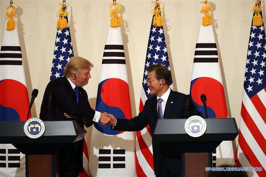 El presidente de República de Corea, Moon Jae-in (d), estrecha la mano con el presidente de Estados Unidos, Donald Trump (i), durante una conferencia de prensa conjunta en la residencia presidencial en Seúl, República de Corea, el 7 de noviembre de 2017. El presidente de Estados Unidos, Donald Trump, y su homólogo surcoreano, Moon Jae-in, acordaron el martes resolver pacíficamente los problemas en la península coreana e impulsar rápidamente las negociaciones para un acuerdo de libre comercio justo entre los dos países. (Xinhua/POOL)