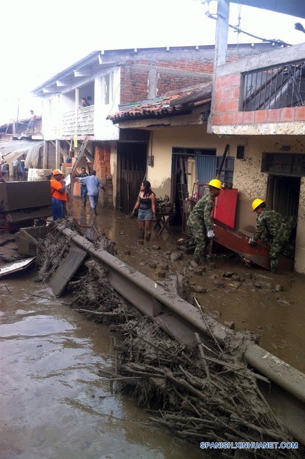 CAUCA, noviembre 8, 2017 (Xinhua) -- Militares ayudan a los residentes en la limpieza de sus viviendas luego de una avalancha de lodo y piedras a causa del desbordamiento del río Paila, en el municipio de Corinto del departamento de Cauca, Colombia, el 8 de noviembre de 2017. Al menos cuatro personas muertas, 28 heridas y 18 desaparecidas dejó una avalancha de lodo y piedras en la población colombiana de Corinto, informaron autoridades. El gobernador del departamento Cauca, Oscar Campo, afirmó que la emergencia se presentó la noche del martes a raíz de las fuertes lluvias de los últimos días, que desbordaron las aguas del río La Paila, afectando a unas 8.000 personas de esa localidad. (Xinhua/Ejercito Nacional/COLPRENSA)