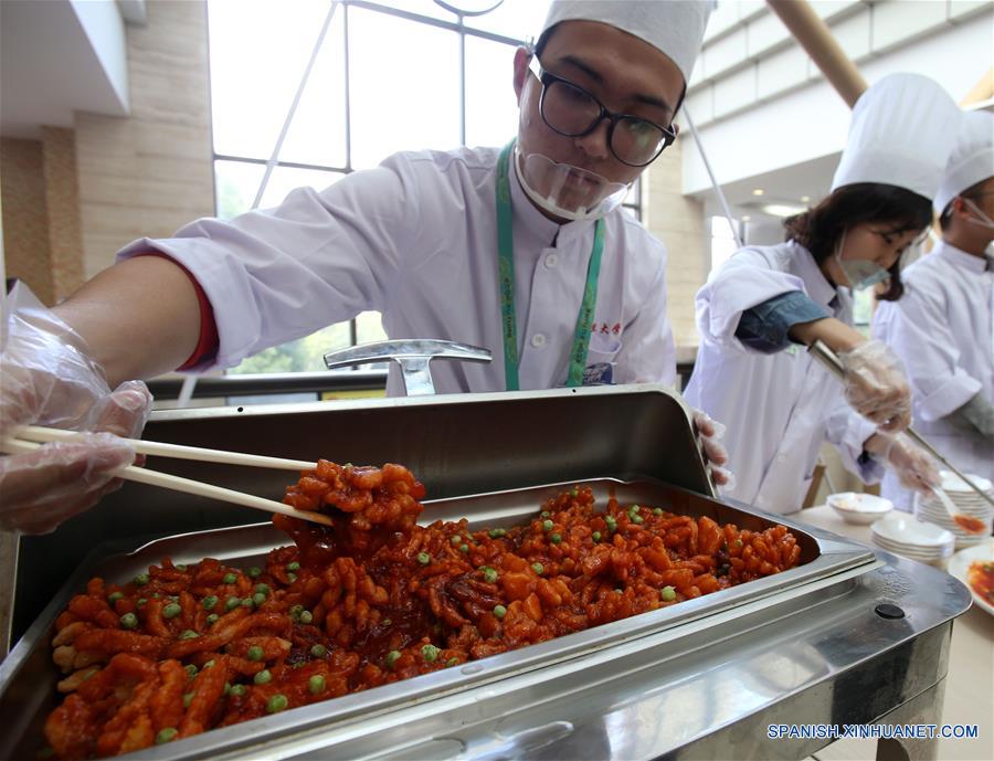 SHANGHAI, noviembre 11, 2017 (Xinhua) -- Cocineros sirven un platillo de mariscos en la Universidad Fudan en Shanghai, en el este de China, el 11 de noviembre de 2017. El primer Festival Universitario de Comida de Shanghai comenzó el sábado, reuniendo platillos de los comedores de 15 universidades. (Xinhua/Liu Ying)