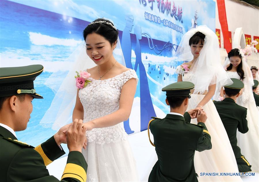 FUZHOU, noviembre 11, 2017 (Xinhua) -- Guardacostas y sus novias participan durante una ceremonia de boda grupal, en la provincia de Fujian, en el sureste de China, el 11 de noviembre de 2017. Seis parejas participaron en la ceremonia. (Xinhua/Zhang Guojun)