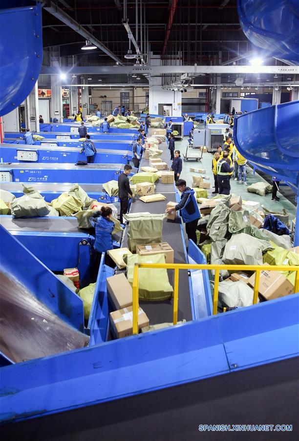SHANGHAI, noviembre 12, 2017 (Xinhua) -- Empleados trabajan en el centro de distribución de ZTO Express, en Shanghai, en el este de China, el 12 de noviembre de 2017. Empresas de mensajería se encontraban trabajando a máxima velocidad para realizar un gran número de entregas luego de las ventas en línea del Día de los Solteros de Alibaba del 11 de noviembre. (Xinhua/Ding Ting)