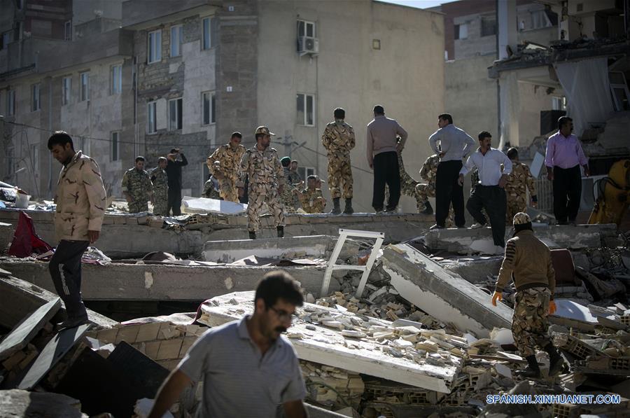 SARPOL E ZAHAB, noviembre 13, 2017 (Xinhua) -- Rescatistas buscan sobrevivientes en edificios colapsados durante un sismo en Sarpol-e Zahab, Irán, el 13 de noviembre de 2017. El poderoso terremoto de magnitud 7.3 que sacudió la región fronteriza entre Irán e Irak el domingo ha provocado la muerte a 445 iraníes, informó el lunes la televisión estatal. (Xinhua/Ahmad Halabisaz)