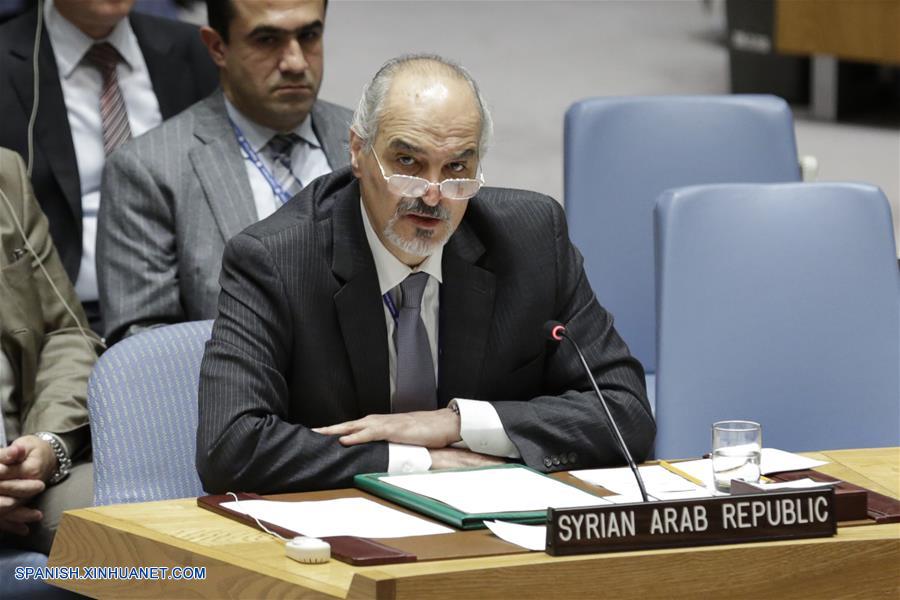 El embajador de Siria ante la Organización de las Naciones Unidas (ONU), Bashar Jaafari (frente), pronuncia un discurso luego de que el Consejo de Seguridad de la ONU no pudiera adoptar una resolución elaborada por Estados Unidos para renovar el mandato del mecanismo que investiga los ataques químicos en Siria, en la sede de la ONU, en Nueva York, Estados Unidos, el 16 de noviembre de 2017.(Xinhua/Li Muzi)