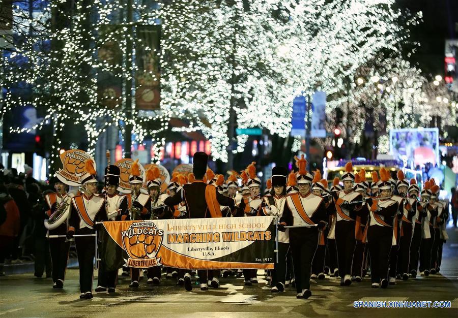 Personas participan en el 26 Desfile del Festival de Luces de Magnificent Mile, en la Avenida North Michigan, en Chicago, Estados Unidos de América, el 18 de noviembre de 2017. Con docenas de carros alegóricos, danzas y actuaciones presentadas por grupos de arte locales y universidades, este desfile marcó el comienzo de la temporada vacacional anual. (Xinhua/Wang Ping)