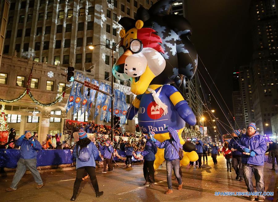 Personas participan en el 26 Desfile del Festival de Luces de Magnificent Mile, en la Avenida North Michigan, en Chicago, Estados Unidos de América, el 18 de noviembre de 2017. Con docenas de carros alegóricos, danzas y actuaciones presentadas por grupos de arte locales y universidades, este desfile marcó el comienzo de la temporada vacacional anual. (Xinhua/Wang Ping)